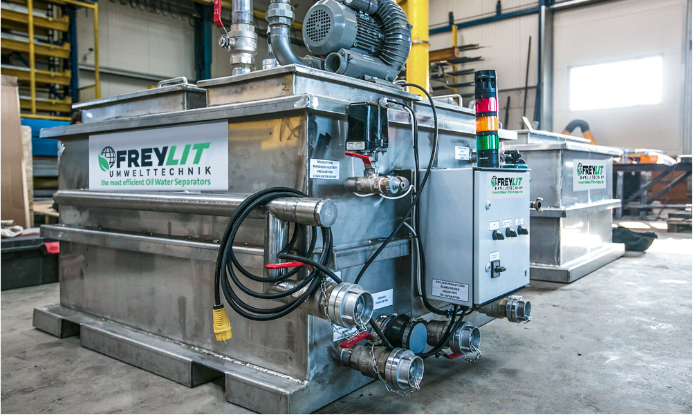 The FREYLIT Flap Skimmer will be placed on the contaminated water surface. A low turbulence double diaphragm flap valve pump driven by compressed air, connected to the Skimmer, creates a surface current and sucks the oily waste water through the Skimmer into the mobile oil separator system.